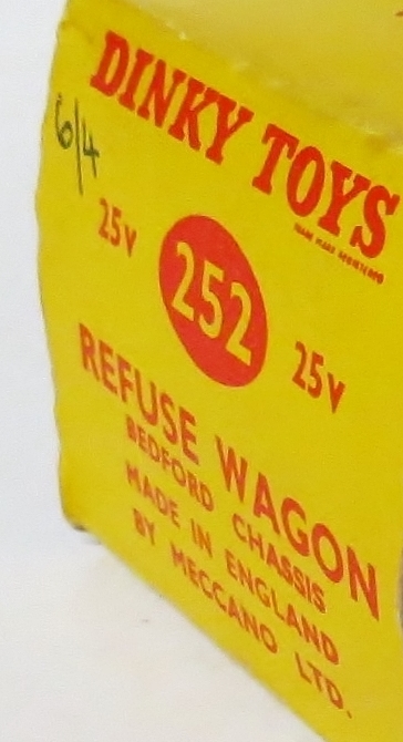 Anyhow, here is another box to be added to the list - a dual numbered 25V/252 Refuse Wagon Bedford Chassis. The dual numbering is rather strange as the box itself was issued between March 1959 and July 1960, four years after dual numbering had ceased. It was also the only box issued for the 252 Refuse Wagon that included the manufacturer's name of "Bedford".