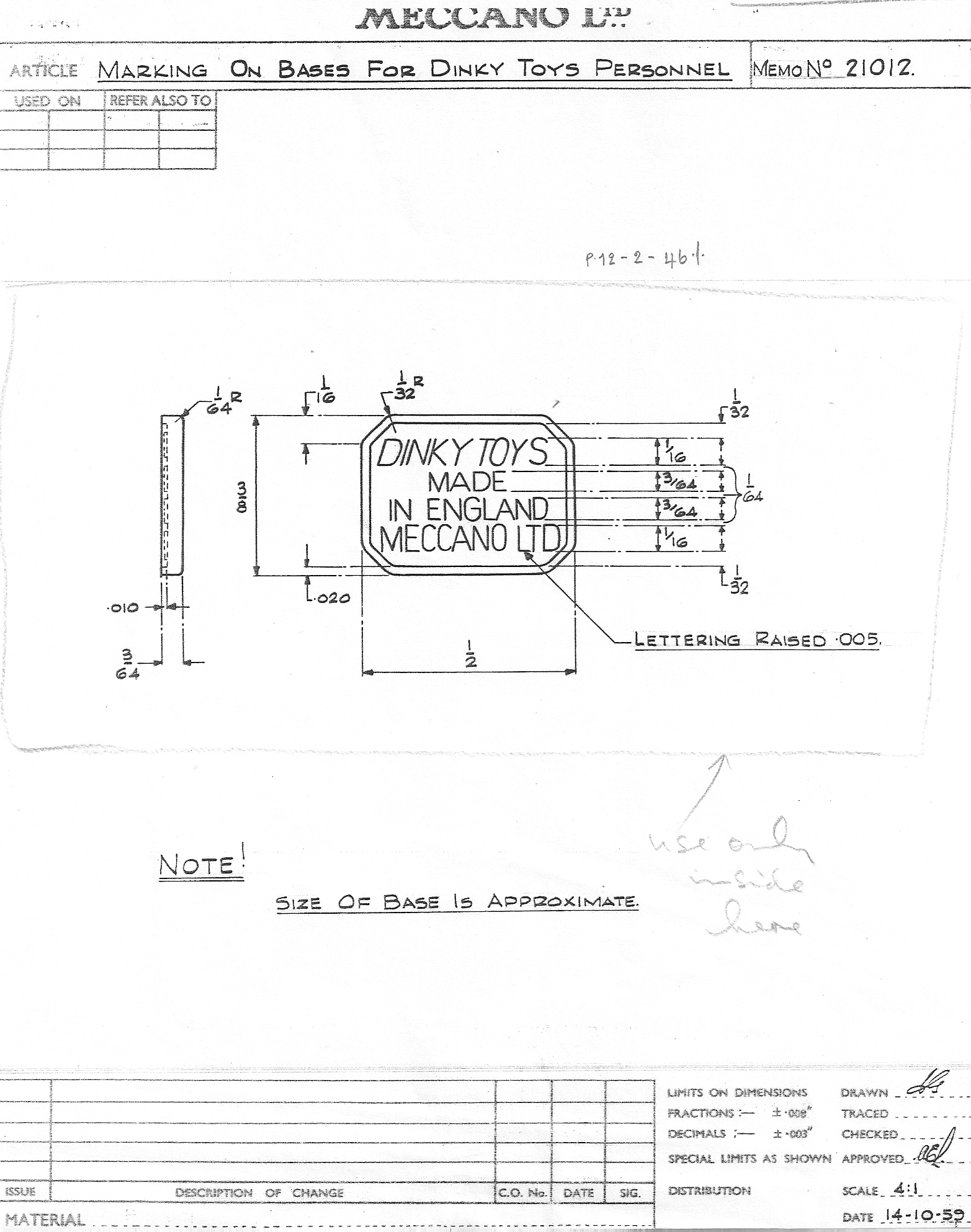 This is the factory memo drawing for base of the Petrol Pump Staff, Set no. 007 made from 1960 to 1967.